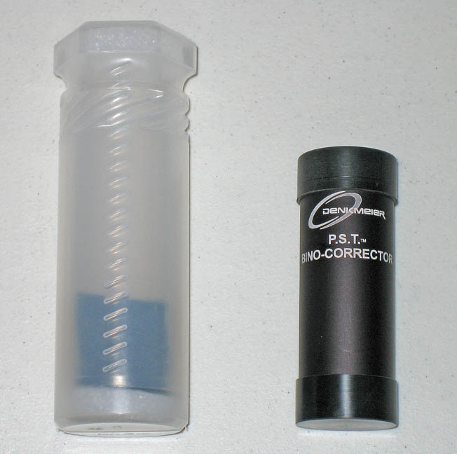 Package includes PST BinoCorrector, lower power lens cell, medium power lens cell, and protective bolt case for storage (as shipped from Denkmeier).