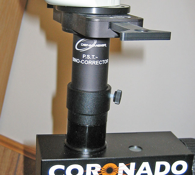 The Denkmeier PST BinoCorrector threads into your Denk binoviewers in place of the nosepiece (see photo below) and can be used with or without the included low power lens cell to achieve breathtaking views of the sun in h-alpha through your own Coronado PST.