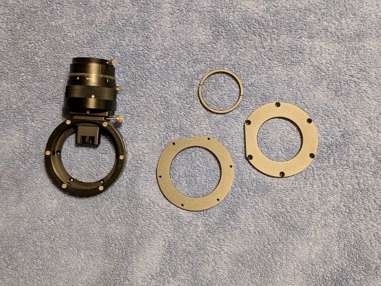 Used for over a year on my 10" RC, but a changing to a CCDT67 to accommodate an SXV-AO required a thinner OAG with a smaller prism. The 14x8mm prism on this OAG should be able to fully illuminate any 1/1.2" sensor, like an IMX174 or IMX585, at fast focal ratios. Includes an M68 (installed in photo), M54, and M48 telescope side adapters, with a female M42 to male M48 adapter. Rear attachment is the semi-standard R31, 6 screw pattern compatible with most filter wheels, including some ZWO models. Price includes CONUS shipping, PayPal only.