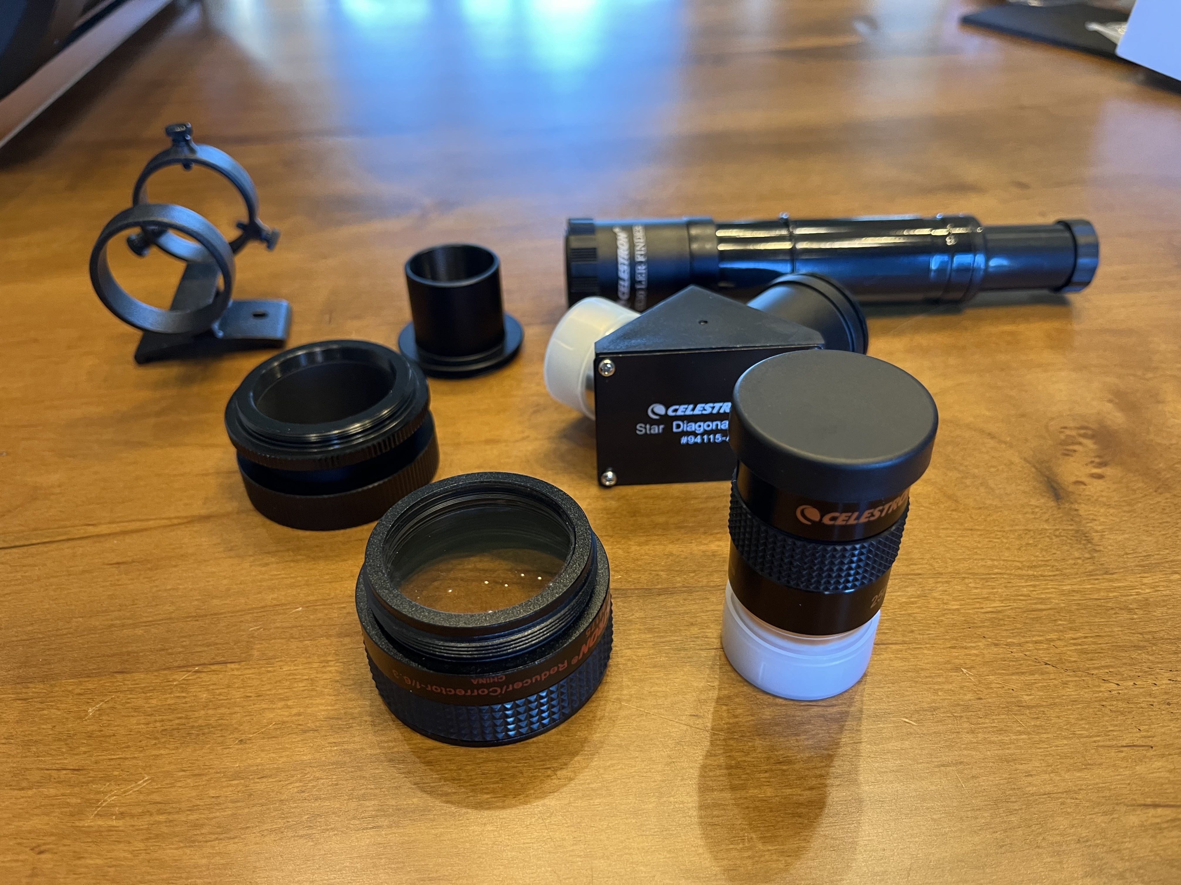 This is a very clean Celestron 9.25" SCT. It was stored inside, and used exclusively for imaging. All pictured accessories are included as well as a Celestron SCT .63x reducer/corrector. I've uploaded a couple of recent images taken with this scope to show the quality of the optics, one at native F/10 and one using a Starizona Corrector IV which is listed seperately on Astromart. Buyer pays shipping, but I would be willing to meet 1/2 way in Oklahoma or N Texas.