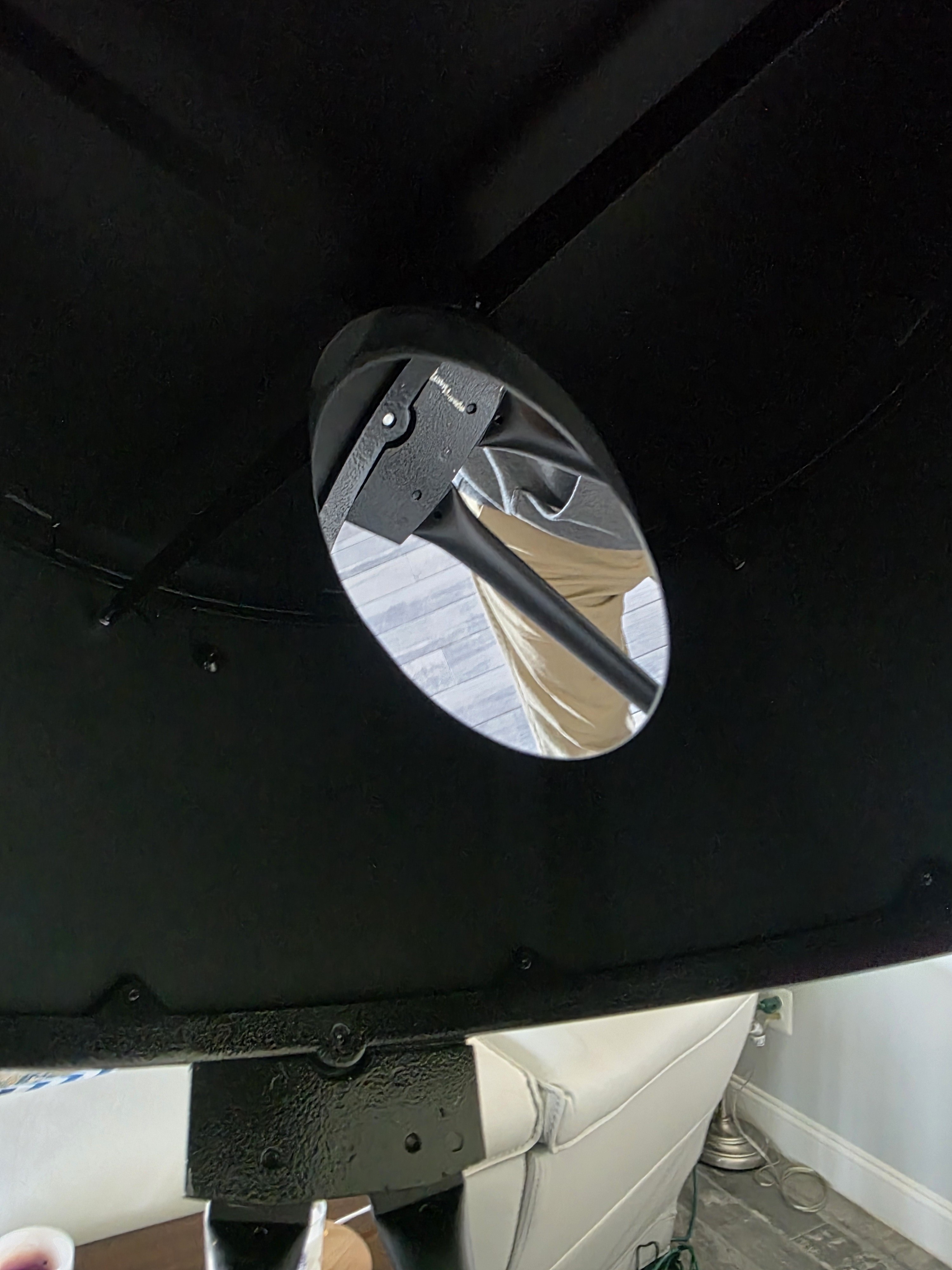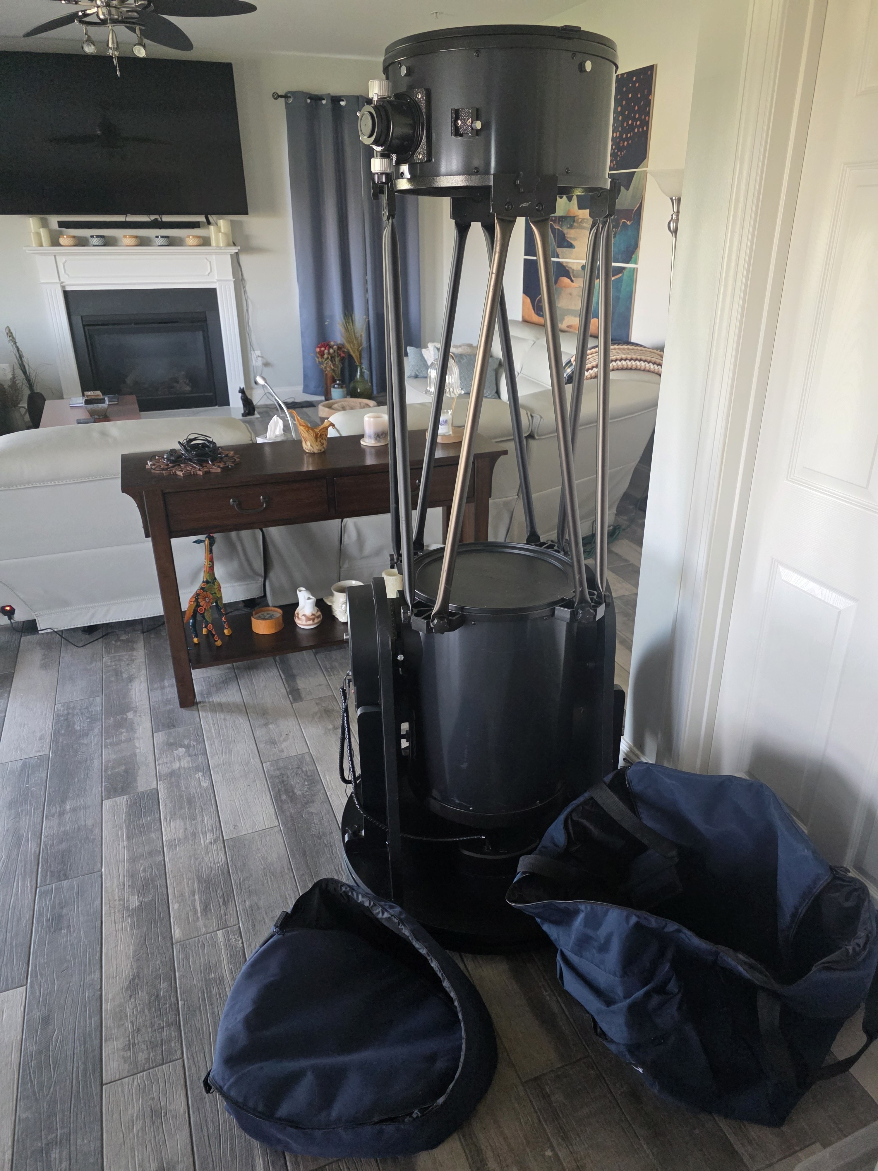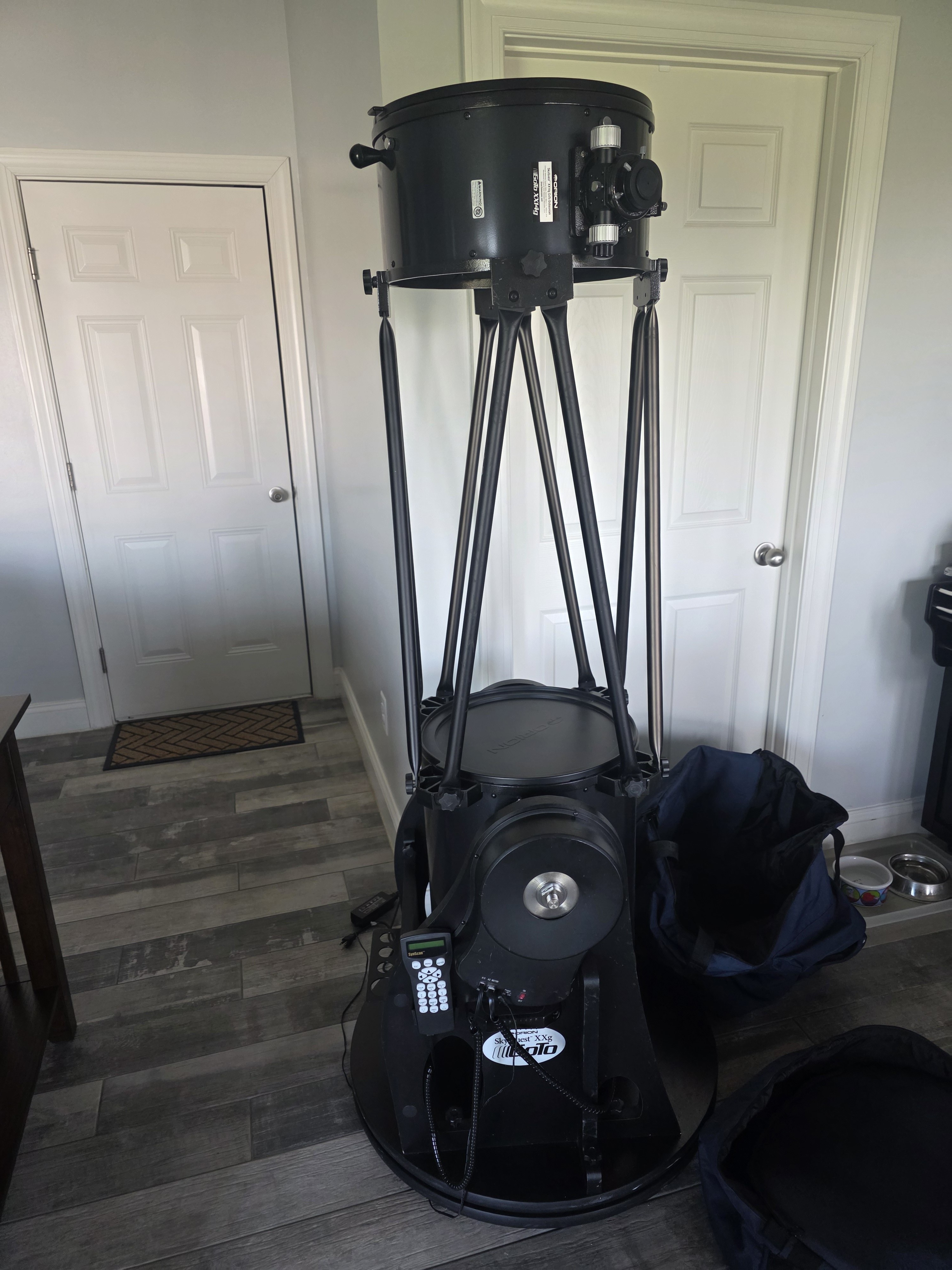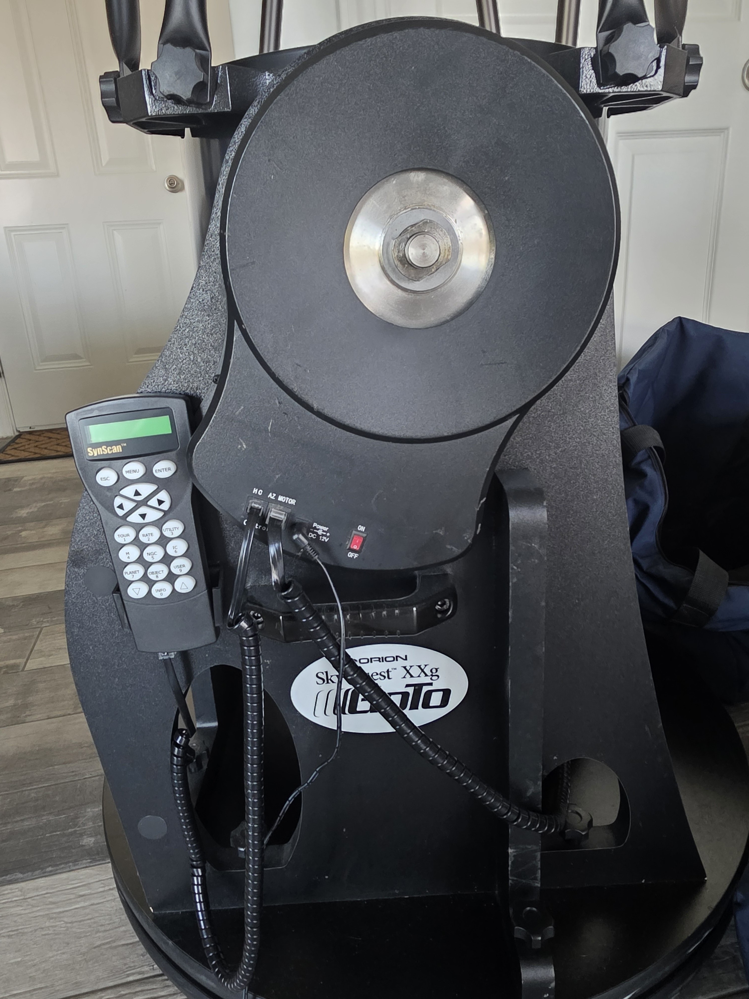 Orion SkyQuest XXG14 GoTo Dob. Optics are in pristine condition. Sadly, never saw 1st light and never taken outside. Comes with two cases for secondary and primary mirror cages, reflex finder, and 26mm 2" eyepiece. The plastic tightening cover for the alt axis is missing but can easily be finger tightened.