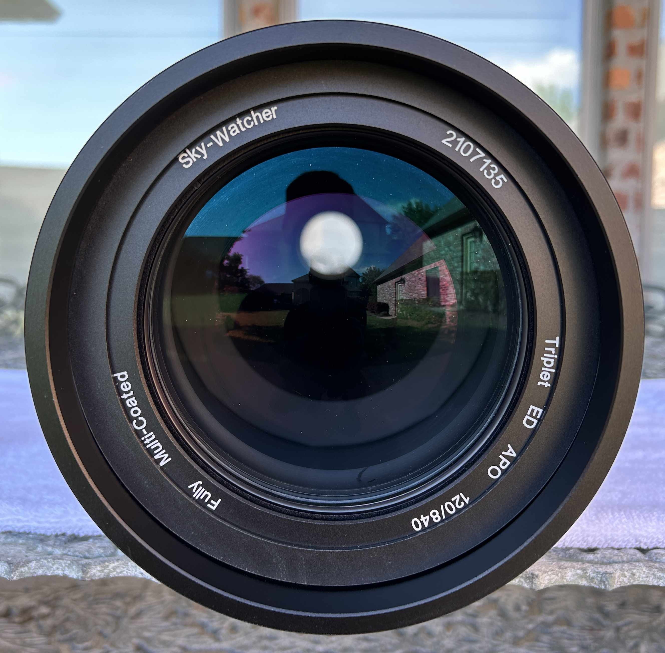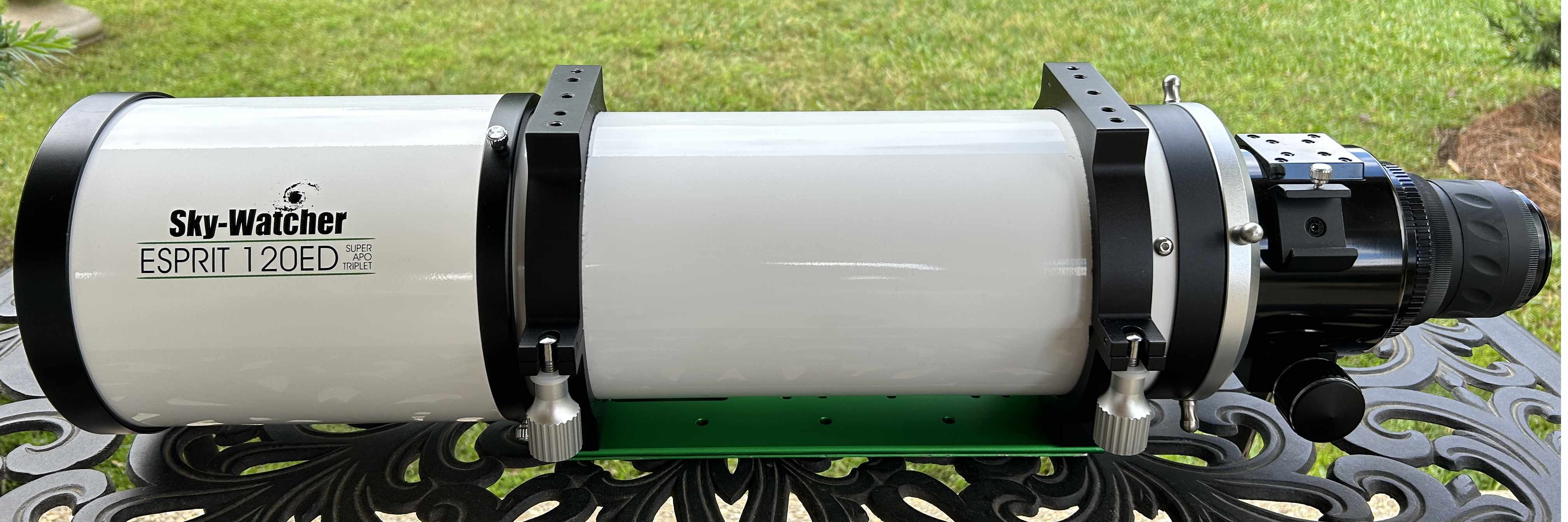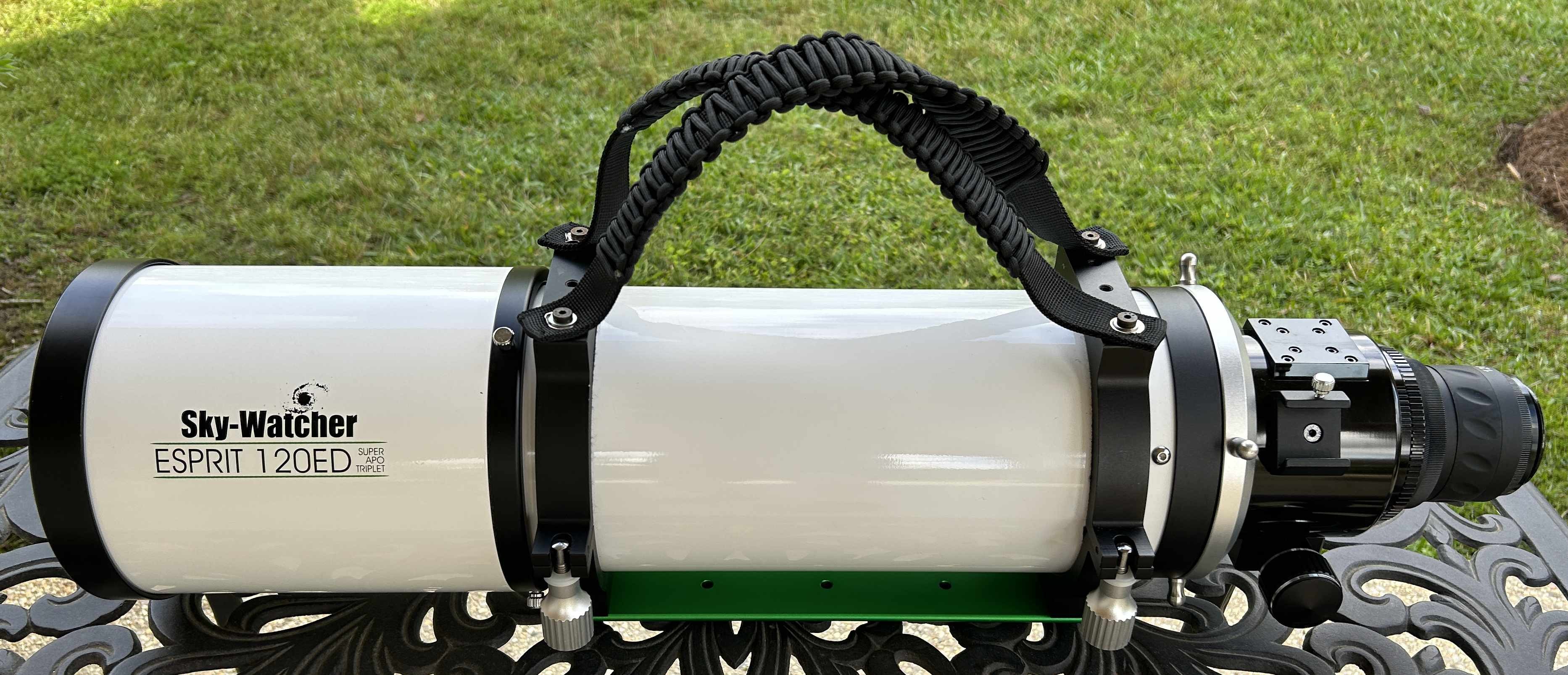 Thank you for looking at this ad. I am selling my Sky-Watcher Esprit 120ED Super Triplet APO. This telescope has been meticulously cared for and is in excellent condition. It has been stored inside my home when not in use. I like the sharp, aberration-free images from this telescope so much that I recently purchased its bigger brother, the Esprit 150, so this telescope needs a new home. All of the original accessories are included; Sky-Watcher field flattener, tube rings, D-style dovetail, 8x50 right-angle finderscope, M48 camera adapter, 2-inch dielectric diagonal, and padded hard case. Also includes my homemade carrying straps.