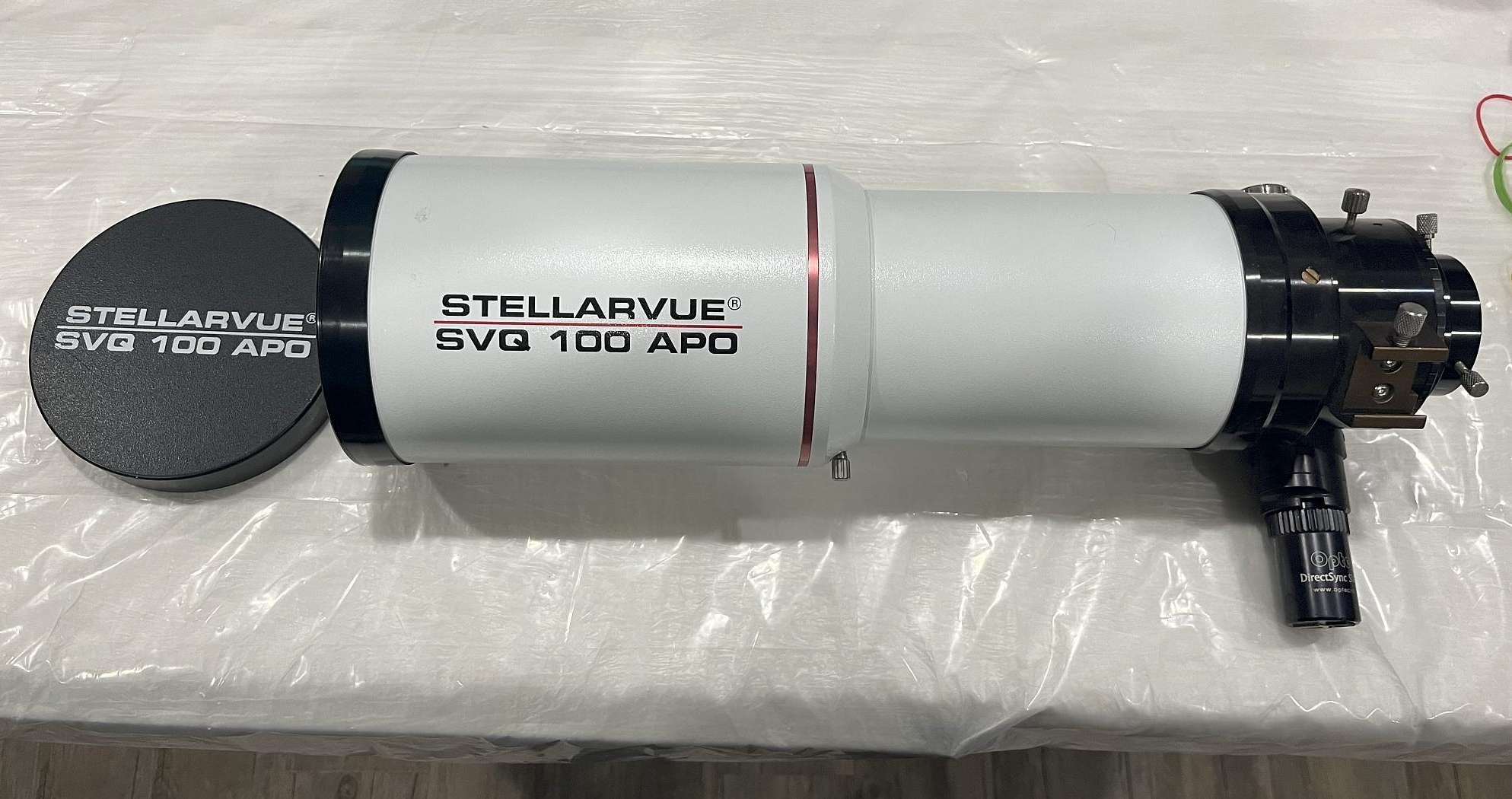 Up for sale is my original owner Stellarvue SVQ100 refractor. A 4 element astrograph, with a fully corrected full frame image circle (although I have only ever used it with 4/3rds or APS-C sized sensors). The scope is 100mm aperture and f/5.8, yielding a 580mm focal length. It has been used for almost all of my imaging for a number of years with great results, but I have recently decided to go with something a little wider and faster. The scope has about 150mm of backfocus with the focuser near midtravel, and like a Petzval, the backfocus spacing is not critical, as the scope only comes to focus at the proper spacing, so you have lots of flexibility is adding accessories into the image train on this scope. The scope comes with the original Stellarvue supplied adapters, rings and custom case, and I will also include some risers and custom Losmandy-style plates if you wish. The scope has a fair amount of dust on the objective, but no scratches or permanent blemishes if any kind.