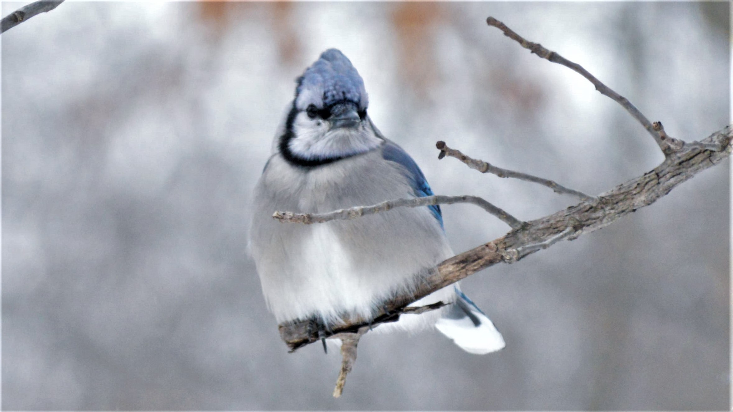 A regal looking blue jay perched in the branches of a hickory tree.